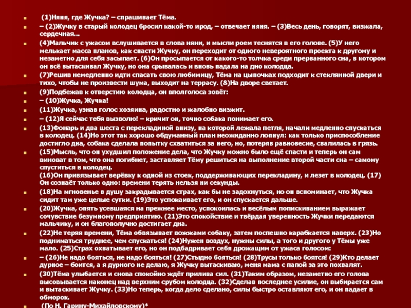 (4)Мальчик с ужасом вслушивается в слова няни, и мысли роем теснятся в его голове. (5)У него мелькает масса планов, как спасти Жучку, он переходит от одного невероятного проекта к другому и незаметно для себя засыпает. (6)Он просыпается от какого-то толчка среди прерванного сна, в котором он всё вытаскивал Жучку, но она срывалась и вновь падала на дно колодца.