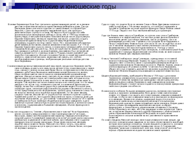 В пансионате особенно большое внимание уделялось изучению иностранных языков, а прилежно занимавшийся Коля делал такие значительные успехи, что Шаден стал водить его к иностранцам, жившим в немецкой слободе, чтобы он мог совершенствоваться в разговорах по-французски и по-немецки. Кроме этих языков, одаренный подросток учился в пансионате греческому,латинскому,английскому и итальянскому.Карамзину,как одному из превосходнейших своих учеников, Шаден давал читать лучшие произведения европейских авторов, особенно французских, а также басни и дидактические сочинения Х.Геллерта,чтобы образовать его вкус, ибо уже предвидел в нём литератора. Здесь же, в пансионе Шадена,началась дружба Карамзина с обаятельным и очень образованным Александром Петровым, который окажет благотворное и сильное влияние на его умственное и нравственное развитие.