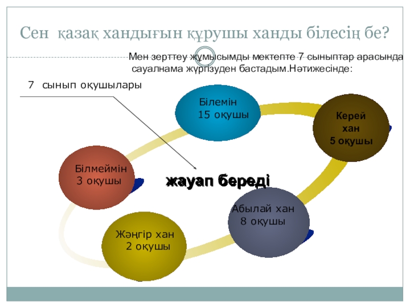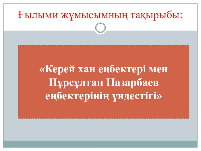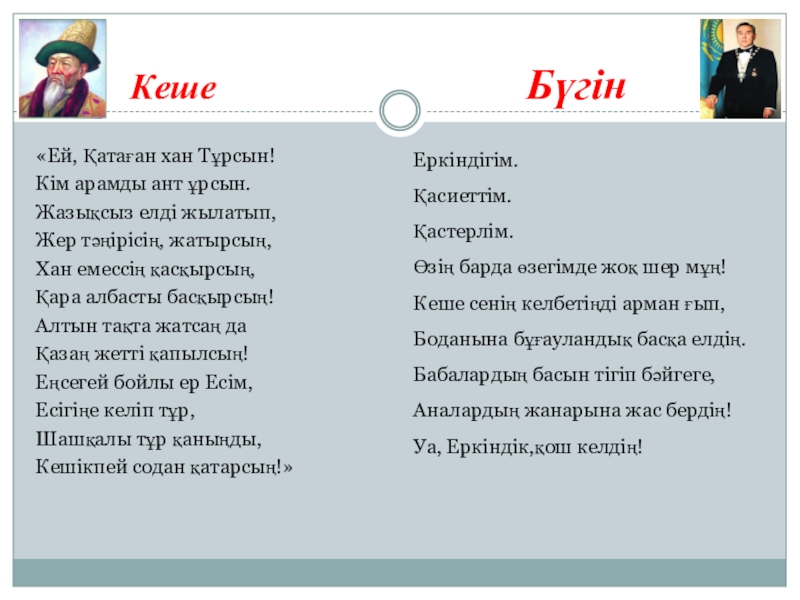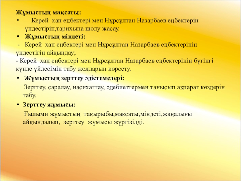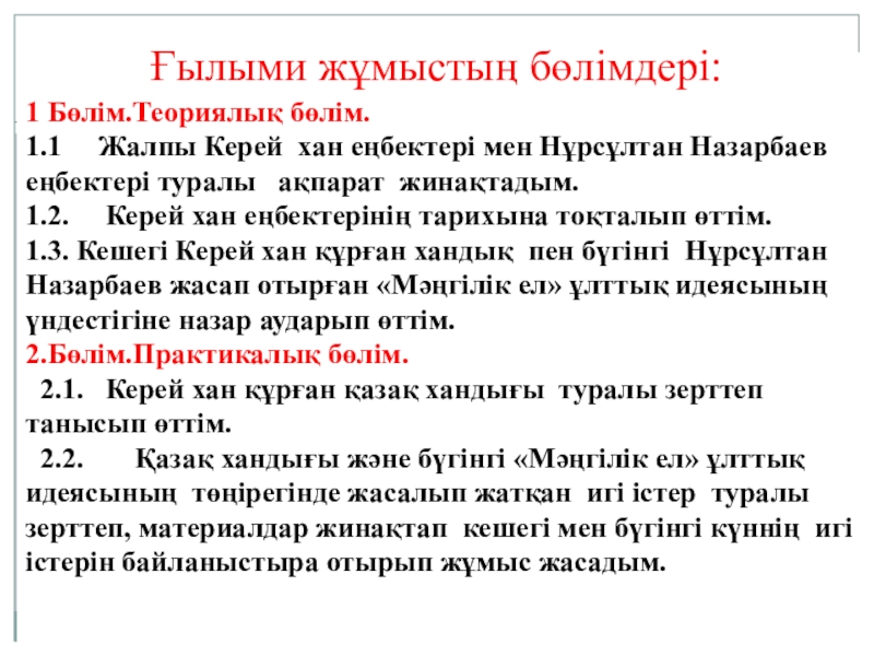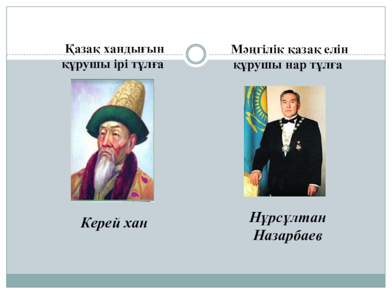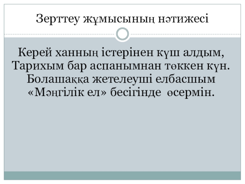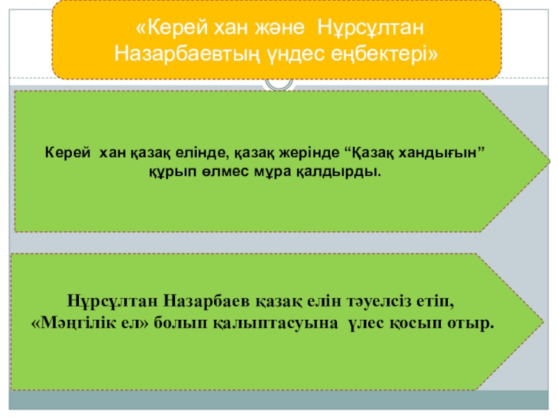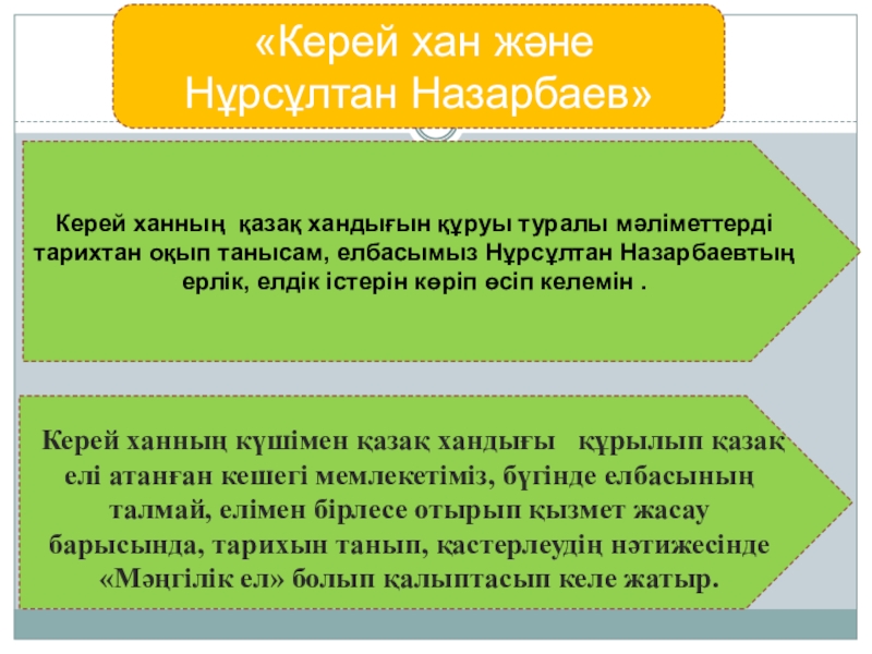 Керей ханның күшімен қазақ хандығы құрылып қазақ елі атанған кешегі мемлекетіміз, бүгінде елбасының талмай, елімен бірлесе отырып қызмет жасау барысында, тарихын танып, қастерлеудің нәтижесінде «Мәңгілік ел» болып қалыптасып келе жатыр.