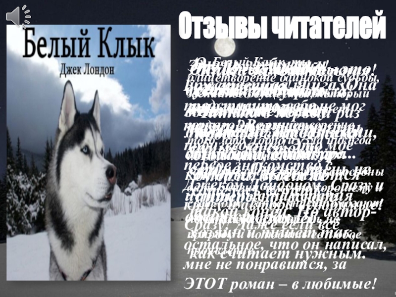 Ах, Белый Клык, ты - олицетворение одинокой судьбы, загнанного существа, который борется, живет и умирает гордым. Это олицетворение того, что Добро из Зла никогда не родится, только созидательные чувства способны дать жизни чему-то хорошему и светлому. Такие книги помогают по новому посмотреть на природу и полюбить ее любое проявление.