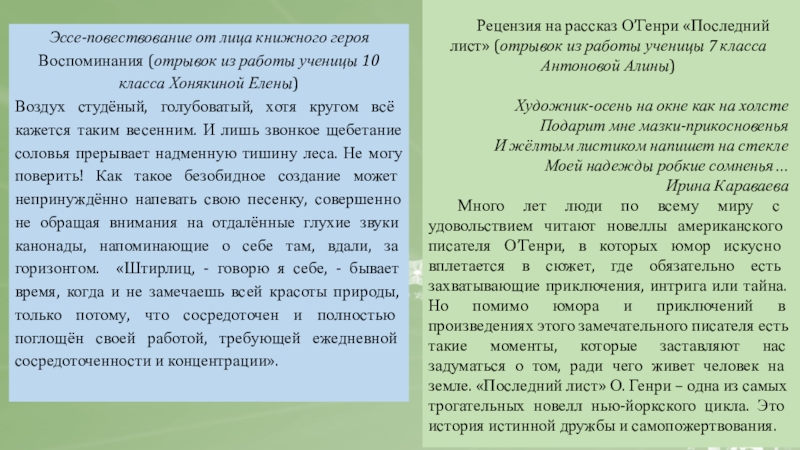 Рецензия на рассказ О’Генри «Последний лист» (отрывок из работы ученицы 7 класса Антоновой Алины)