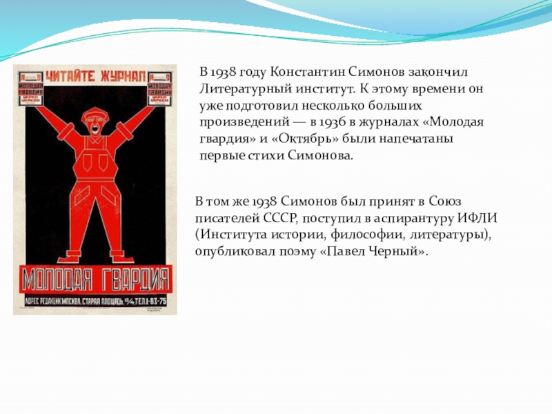 В том же 1938 Симонов был принят в Союз писателей СССР, поступил в аспирантуру ИФЛИ (Института истории, философии, литературы), опубликовал поэму «Павел Черный».