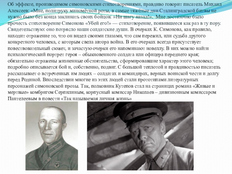 Слайд 8Об эффекте, производимом симоновскими стихотворениями, правдиво говорит писатель Михаил Алексеев: «Мне,