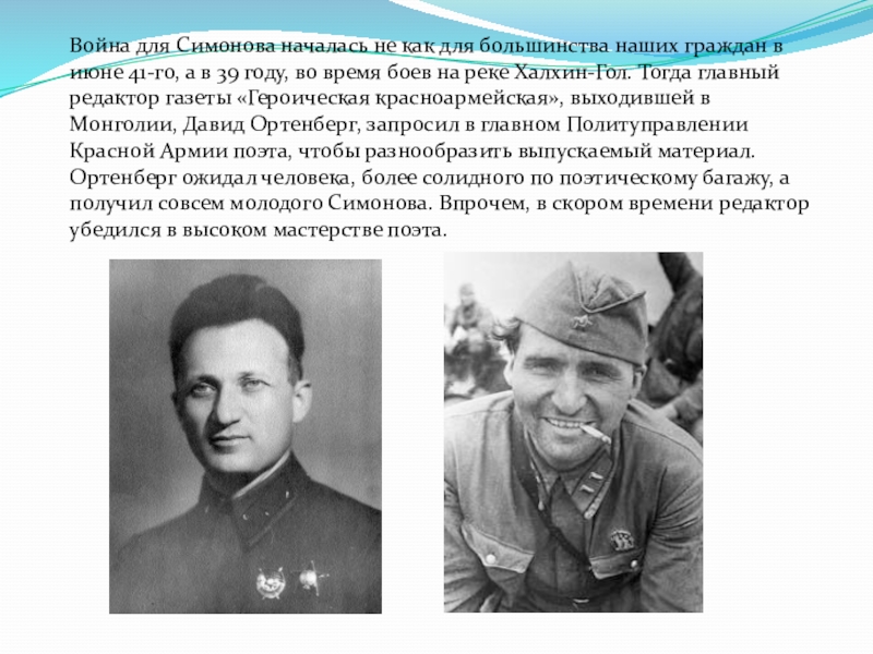 июне 41-го, а в 39 году, во время боев на реке Халхин-Гол. Тогда главный редактор газеты «Героическая красноармейская», выходившей в Монголии, Давид Ортенберг, запросил в главном Политуправлении Красной Армии поэта, чтобы разнообразить выпускаемый материал. Ортенберг ожидал человека, более солидного по поэтическому багажу, а получил совсем молодого Симонова. Впрочем, в скором времени редактор убедился в высоком мастерстве поэта.
