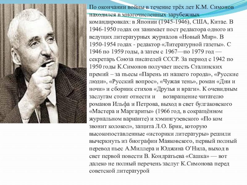многочисленных зарубежных командировках: в Японии (1945-1946), США, Китае. В 1946-1950 годах он занимает пост редактора одного из ведущих литературных журналов «Новый Мир». В 1950-1954 годах - редактор «Литературной газеты». С 1946 по 1959 годы, а затем с 1967—по 1979 год — секретарь Союза писателей СССР. За период с 1942 по 1950 годы К.Симонов получает шесть Сталинских премий – за пьесы «Парень из нашего города», «Русские люди», «Русский вопрос», «Чужая тень», роман «Дни и ночи» и сборник стихов «Друзья и враги». К очевидным заслугам стоит отнести и возвращение читателю романов Ильфа и Петрова, выход в свет булгаковского «Мастера и Маргариты» (1966 год, в сокращённом журнальном варианте) и хэмингуэевского «По ком звонит колокол», защита Л.О. Брик, которую высокопоставленные «историки литературы» решили вычеркнуть из биографии Маяковского, первый полный перевод пьес А.Миллера и Юджина О’Нила, выход в свет первой повести В. Кондратьева «Сашка» — вот далеко не полный перечень заслуг К.Симонова перед советской литературой