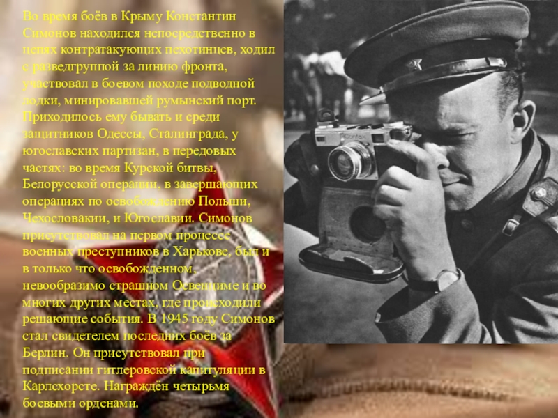 Слайд 9Во время боёв в Крыму Константин Симонов находился непосредственно в цепях
