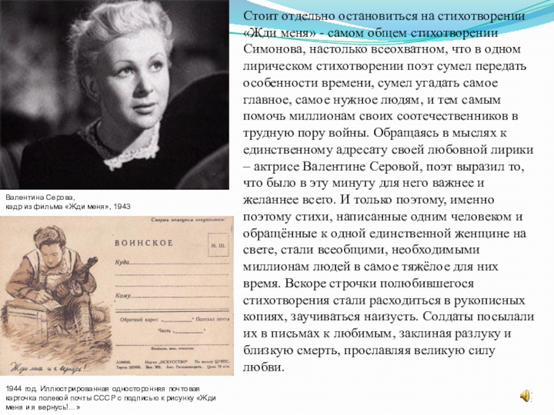 Симонова, настолько всеохватном, что в одном лирическом стихотворении поэт сумел передать особенности времени, сумел угадать самое главное, самое нужное людям, и тем самым помочь миллионам своих соотечественников в трудную пору войны. Обращаясь в мыслях к единственному адресату своей любовной лирики – актрисе Валентине Серовой, поэт выразил то, что было в эту минуту для него важнее и желаннее всего. И только поэтому, именно поэтому стихи, написанные одним человеком и обращённые к одной единственной женщине на свете, стали всеобщими, необходимыми миллионам людей в самое тяжёлое для них время. Вскоре строчки полюбившегося стихотворения стали расходиться в рукописных копиях, заучиваться наизусть. Солдаты посылали их в письмах к любимым, заклиная разлуку и близкую смерть, прославляя великую силу любви.