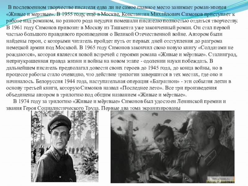 роман-эпопея «Живые и мертвые». В 1955 году, ещё в Москве, Константин Михайлович Симонов приступает к работе над романом, но разного рода неудачи помешали писателю полностью отдаться творчеству. В 1961 году Симонов привозит в Москву из Ташкента уже законченный роман. Он стал первой частью большого правдивого произведения о Великой Отечественной войне. Автором были найдены герои, с которыми читатель пройдет путь от первых дней отступления до разгрома немецкой армии под Москвой. В 1965 году Симонов закончил свою новую книгу «Солдатами не рождаются», которая является новой встречей с героями романа «Живые и мёртвые». Сталинград, неприукрашенная правда жизни и войны на новом этапе - одолении науки побеждать. В дальнейшем писатель предполагал довести своих героев до 1945 года, до конца войны, но в процессе работы стало очевидно, что действие трилогии завершится в тех местах, где оно и начиналось. Белоруссия 1944 года, наступательная операция «Багратион» - эти события легли в основу третьей книги, которую Симонов назвал «Последнее лето». Все три произведения объединены автором в трилогию под общим названием «Живые и мёртвые».