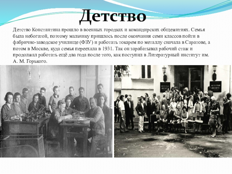 Слайд 3Детство Константина прошло в военных городках и командирских общежитиях. Семья была