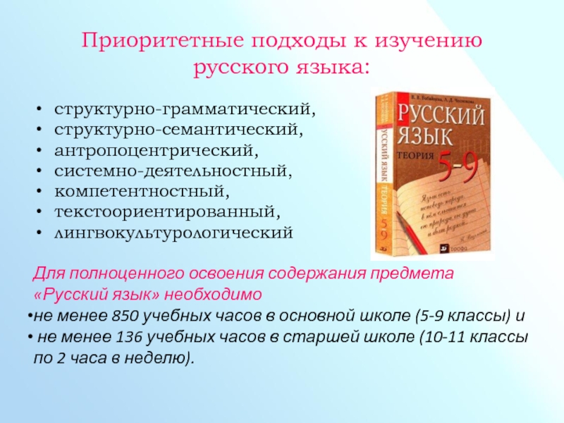 Слайд 10Приоритетные подходы к изучению русского языка:
