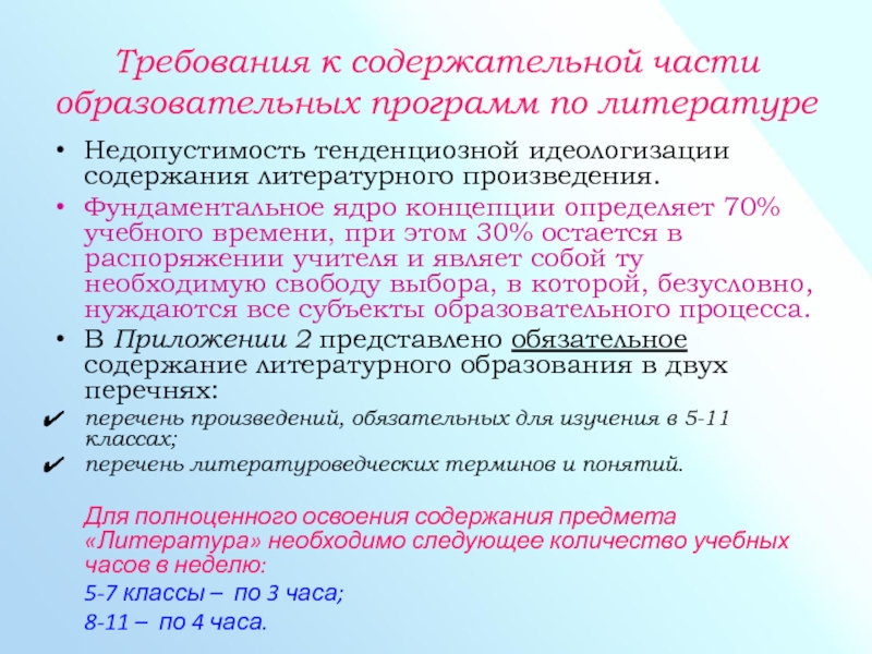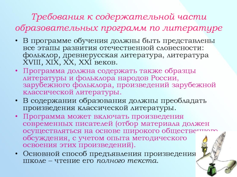 Слайд 14Требования к содержательной части образовательных программ по литературе