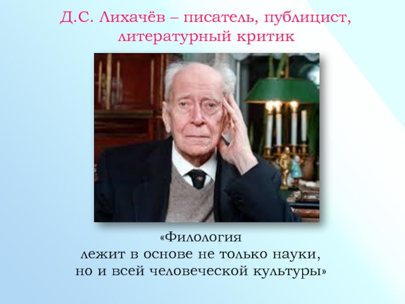 Слайд 6Д.С. Лихачёв – писатель, публицист, литературный критик
