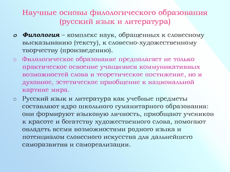 Русский язык и литература как учебные предметы составляют ядро школьного гуманитарного образования: они формируют языковую личность, приобщают учеников к красоте и богатству художественного слова, помогают овладеть всеми возможностями родного языка и потенциалом словесного искусства для дальнейшего саморазвития и самореализации.