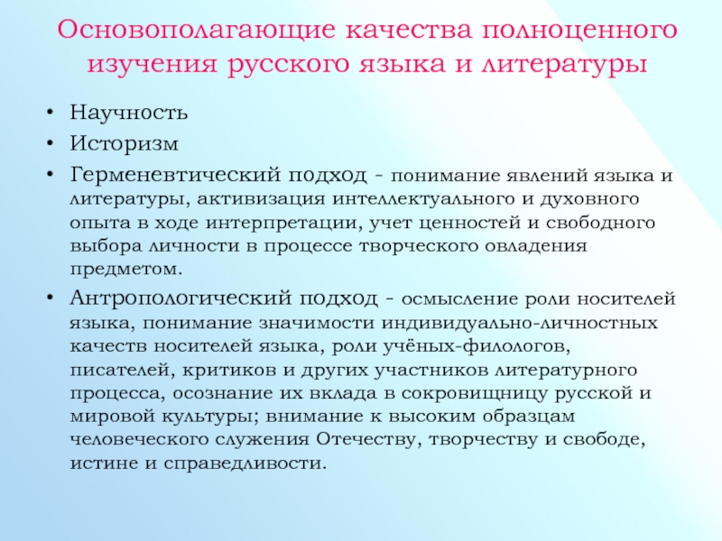 Слайд 7Основополагающие качества полноценного изучения русского языка и литературы
