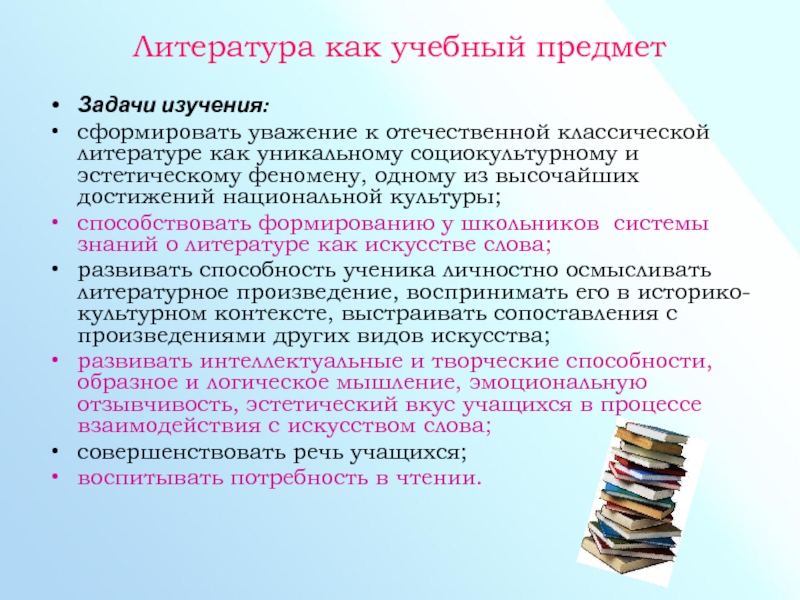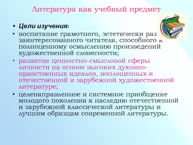 целенаправленное и системное приобщение молодого поколения к наследию отечественной и зарубежной классической литературы и лучшим образцам современной литературы.