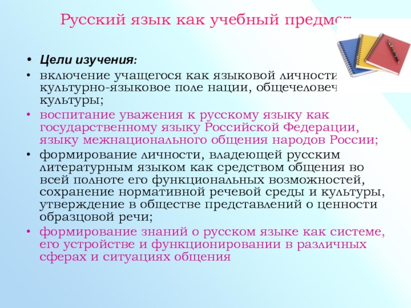 формирование личности, владеющей русским литературным языком как средством общения во всей полноте его функциональных возможностей, сохранение нормативной речевой среды и культуры, утверждение в обществе представлений о ценности образцовой речи;