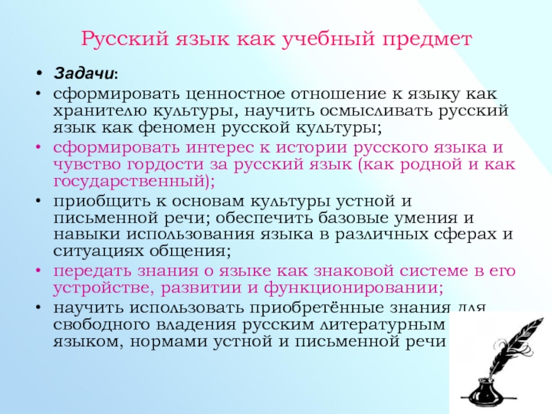 приобщить к основам культуры устной и письменной речи; обеспечить базовые умения и навыки использования языка в различных сферах и ситуациях общения;