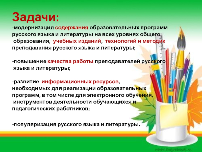 общего образования, учебных изданий, технологий и методик преподавания русского языка и литературы; -повышение качества работы преподавателей русского языка и литературы; -развитие информационных ресурсов, необходимых для реализации образовательных программ, в том числе для электронного обучения, инструментов деятельности обучающихся и педагогических работников; -популяризация русского языка и литературы.