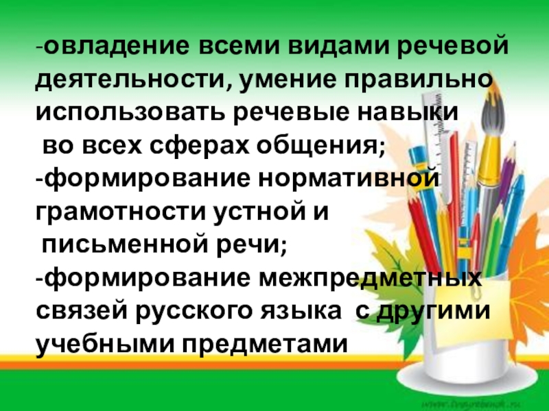 всех сферах общения; -формирование нормативной грамотности устной и письменной речи; -формирование межпредметных связей русского языка с другими учебными предметами