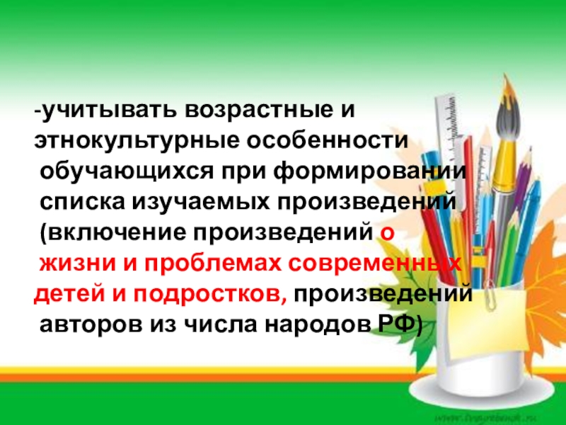 Слайд 13 -учитывать возрастные и этнокультурные особенности обучающихся при формировании списка изучаемых произведений