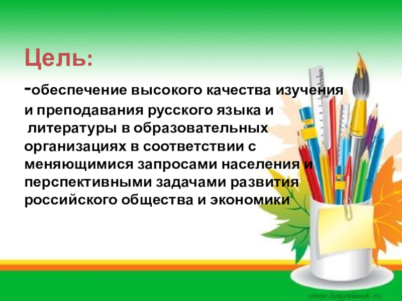Слайд 4Цель: -обеспечение высокого качества изучения и преподавания русского языка и литературы в
