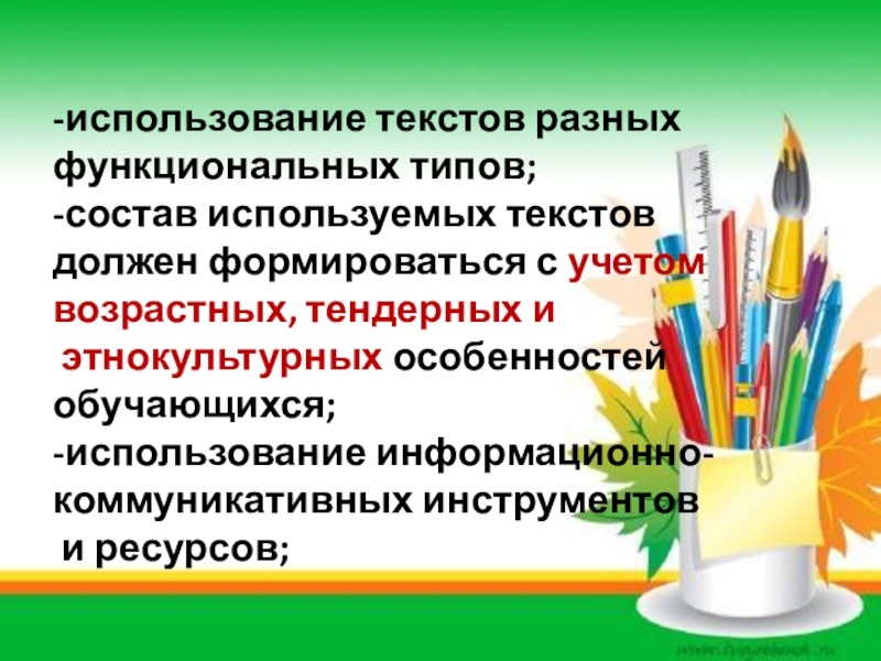 Слайд 9 -использование текстов разных функциональных типов; -состав используемых текстов должен формироваться с учетом
