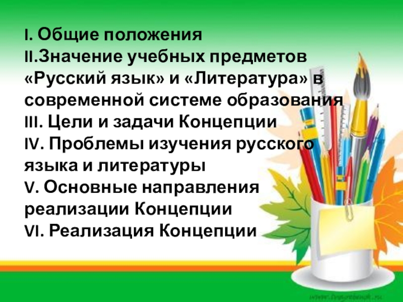 системе образования III. Цели и задачи Концепции IV. Проблемы изучения русского языка и литературы V. Основные направления реализации Концепции VI. Реализация Концепции