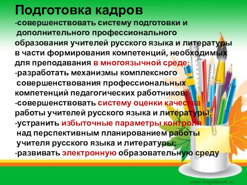 Слайд 15 Подготовка кадров -совершенствовать систему подготовки и дополнительного профессионального образования учителей русского языка
