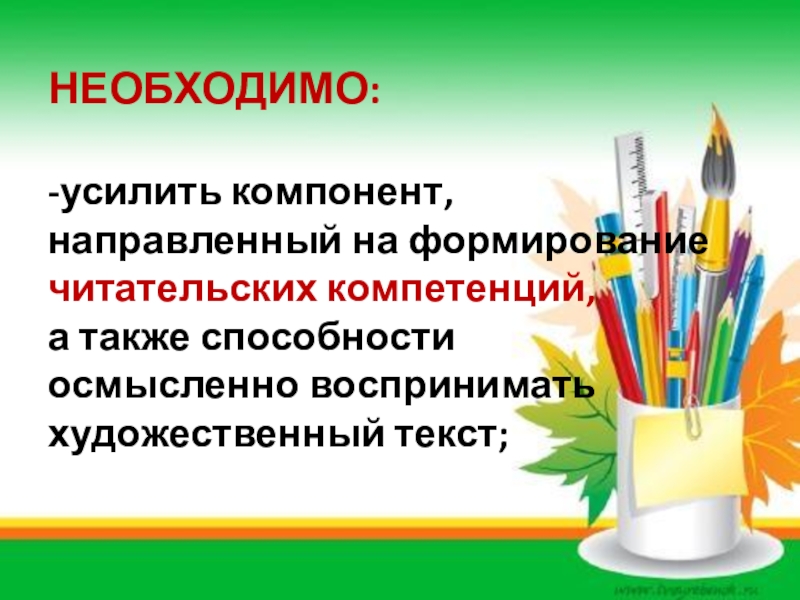 НЕОБХОДИМО:  -усилить компонент,  направленный на формирование читательских компетенций,