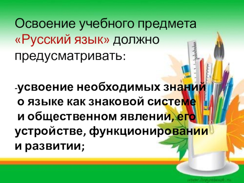 Слайд 7 Освоение учебного предмета «Русский язык» должно предусматривать: -усвоение необходимых знаний о языке