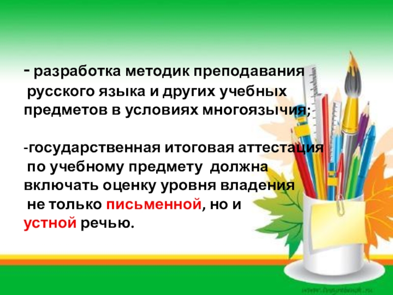 условиях многоязычия; -государственная итоговая аттестация по учебному предмету должна включать оценку уровня владения не только письменной, но и устной речью.