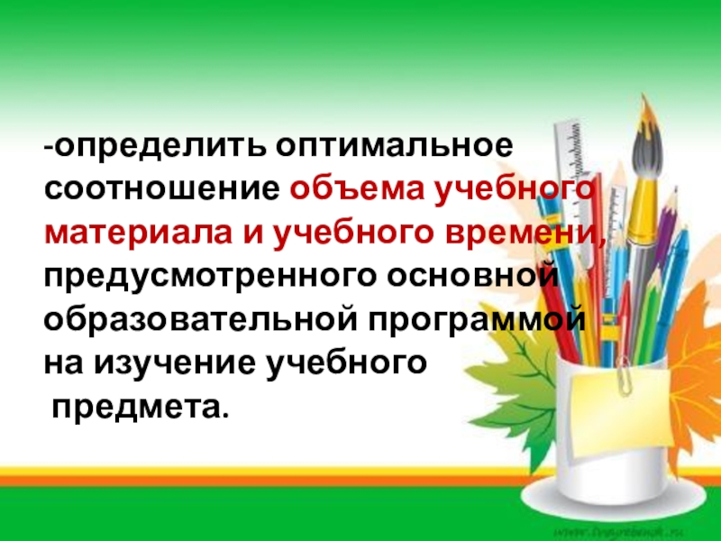 Слайд 14 -определить оптимальное соотношение объема учебного материала и учебного времени, предусмотренного основной