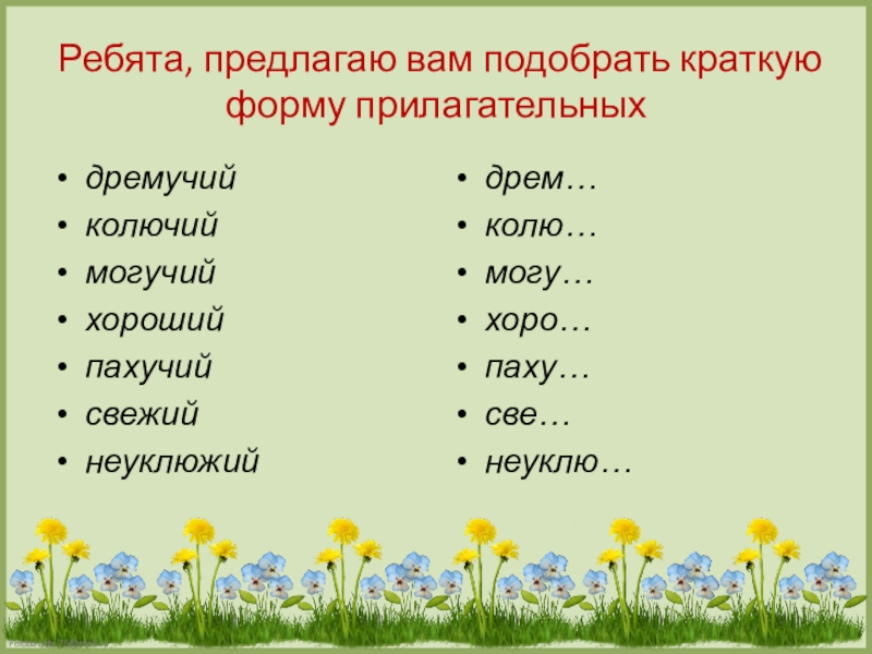 Ребята, предлагаю вам подобрать краткую форму прилагательныхдремучийколючиймогучийхорошийпахучийсвежийнеуклюжийдрем…колю…могу…хоро…паху…све…неуклю…