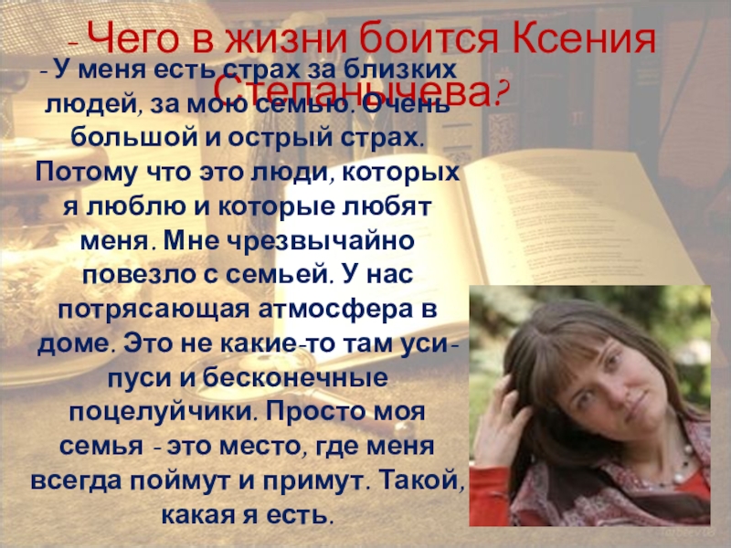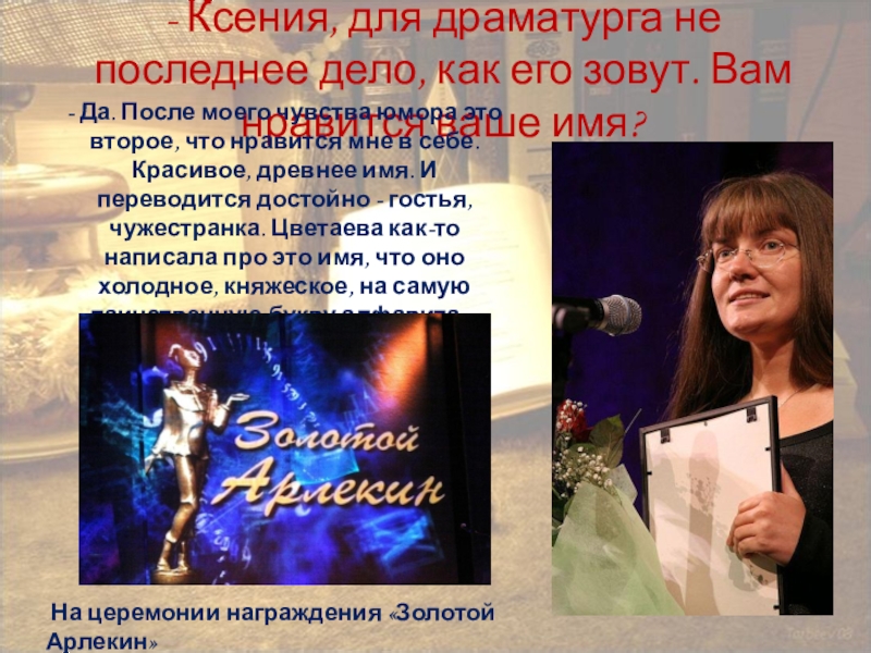 - Да. После моего чувства юмора это второе, что нравится мне в себе. Красивое, древнее имя. И переводится достойно - гостья, чужестранка. Цветаева как-то написала про это имя, что оно холодное, княжеское, на самую таинственную букву алфавита – «икс».