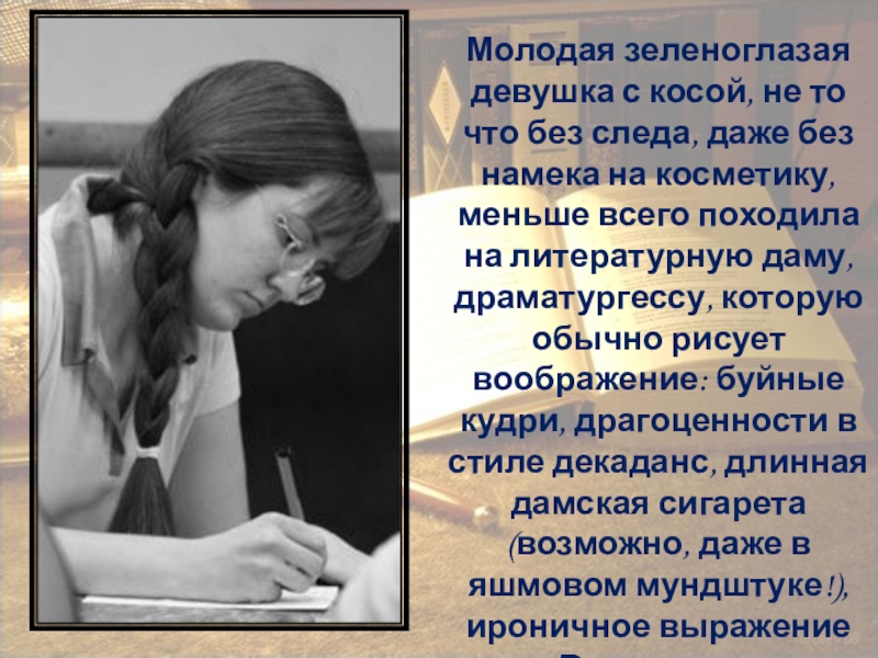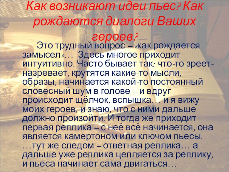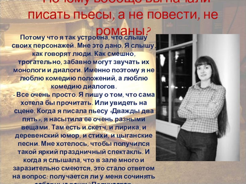 Потому что я так устроена, что слышу своих персонажей. Мне это дано. Я слышу, как говорят люди. Как смешно, трогательно, забавно могут звучать их монологи и диалоги. Именно поэтому я не люблю комедию положений, а люблю комедию диалогов.