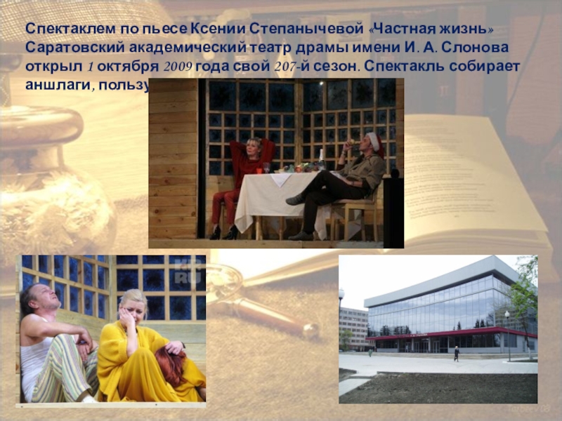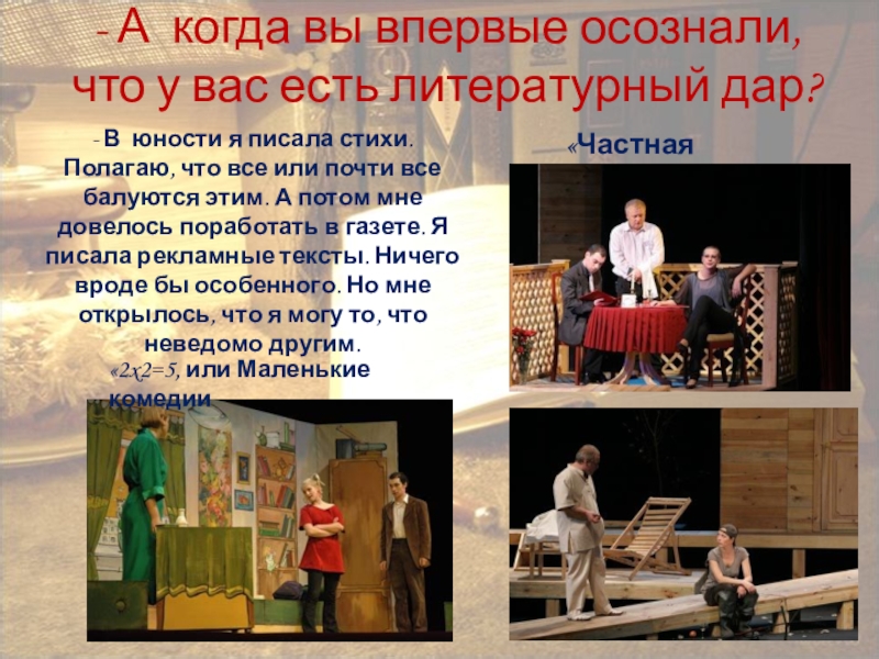 - Все очень просто. Я пишу о том, что сама хотела бы прочитать. Или увидеть на сцене. Когда я писала пьесу «Дважды два пять», я насытила ее очень разными вещами. Там есть и скетч, и лирика, и деревенский юмор, и стихи, и цыганские песни. Мне хотелось, чтобы получился такой яркий праздничный спектакль. И когда я слышала, что в зале много и заразительно смеются, это стало ответом на вопрос: получается ли у меня сочинять забавные вещи? Получается.
