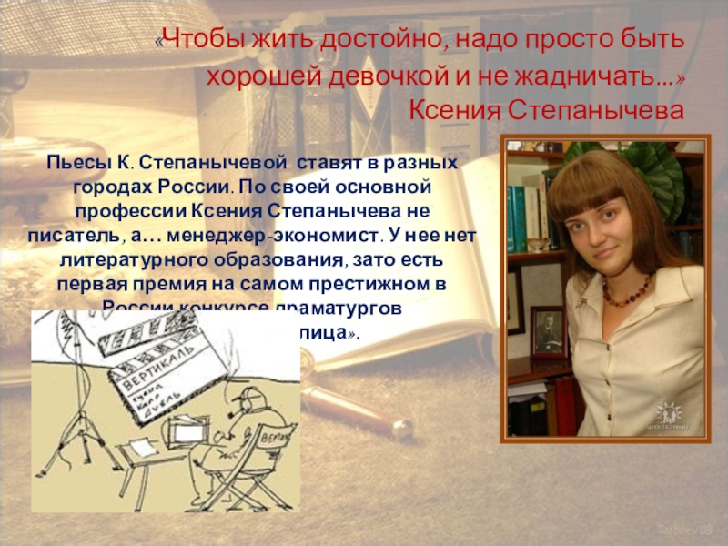 Пьесы К. Степанычевой ставят в разных городах России. По своей основной профессии Ксения Степанычева не писатель, а… менеджер-экономист. У нее нет литературного образования, зато есть первая премия на самом престижном в России конкурсе драматургов «Действующие лица».
