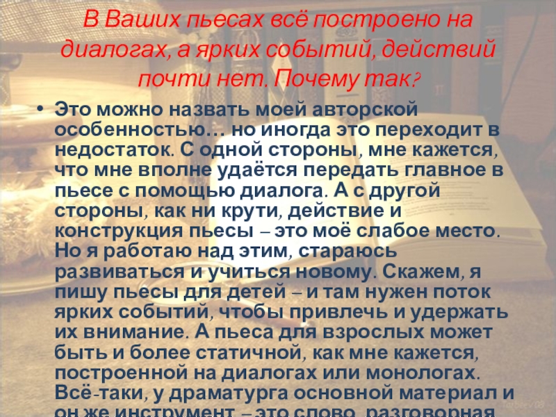 Это можно назвать моей авторской особенностью… но иногда это переходит в недостаток. С одной стороны, мне кажется, что мне вполне удаётся передать главное в пьесе с помощью диалога. А с другой стороны, как ни крути, действие и конструкция пьесы – это моё слабое место. Но я работаю над этим, стараюсь развиваться и учиться новому. Скажем, я пишу пьесы для детей – и там нужен поток ярких событий, чтобы привлечь и удержать их внимание. А пьеса для взрослых может быть и более статичной, как мне кажется, построенной на диалогах или монологах. Всё-таки, у драматурга основной материал и он же инструмент – это слово, разговорная речь…