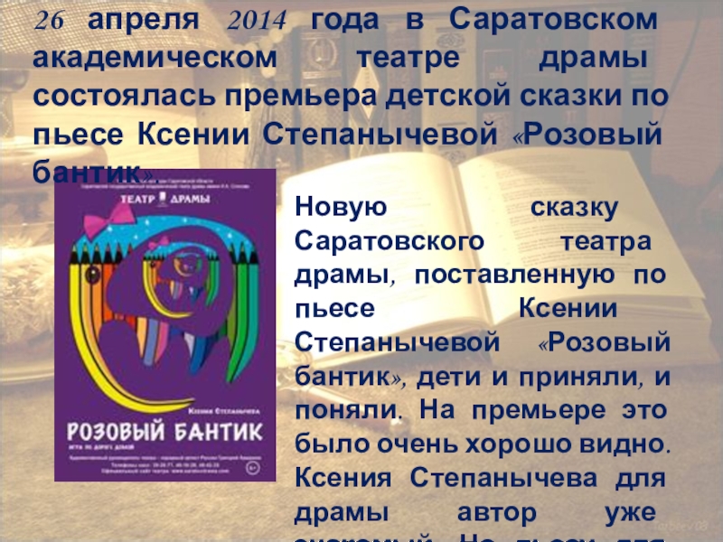 Новую сказку Саратовского театра драмы, поставленную по пьесе Ксении Степанычевой «Розовый бантик», дети и приняли, и поняли. На премьере это было очень хорошо видно. Ксения Степанычева для драмы автор уже знакомый. Но пьесу для детей по ее сценарию здесь поставили впервые.