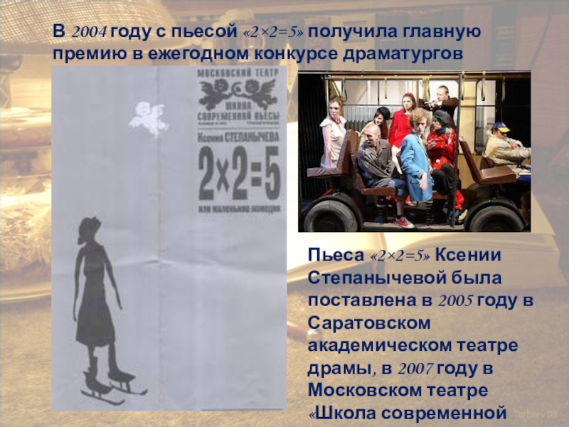 Пьеса «2×2=5» Ксении Степанычевой была поставлена в 2005 году в Саратовском академическом театре драмы, в 2007 году в Московском театре «Школа современной пьесы».
