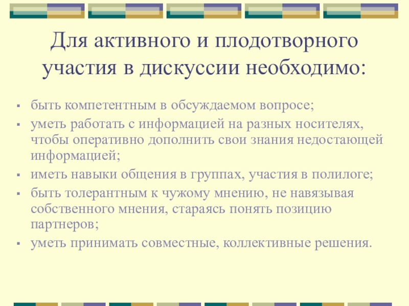 Слайд 11Для активного и плодотворного участия в дискуссии необходимо: