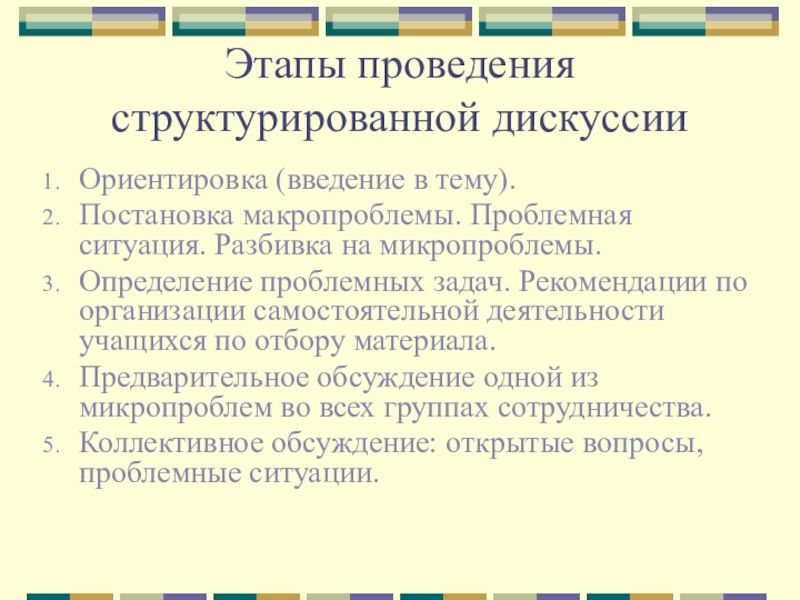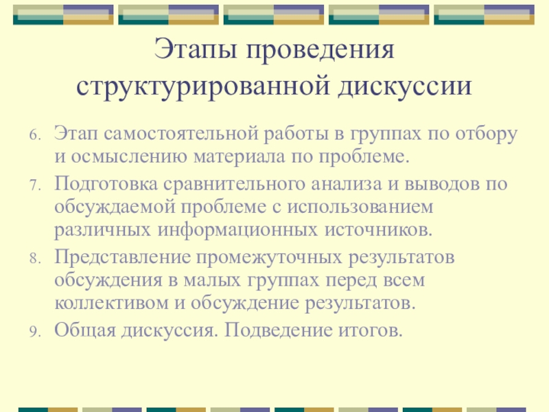 Представление промежуточных результатов обсуждения в малых группах перед всем коллективом и обсуждение результатов.