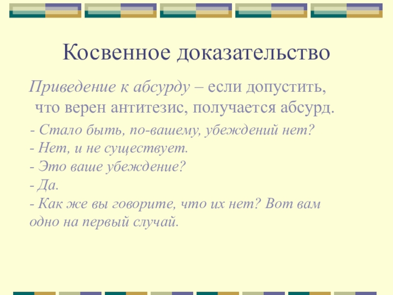 Приведение к абсурду – если допустить, что верен антитезис, получается