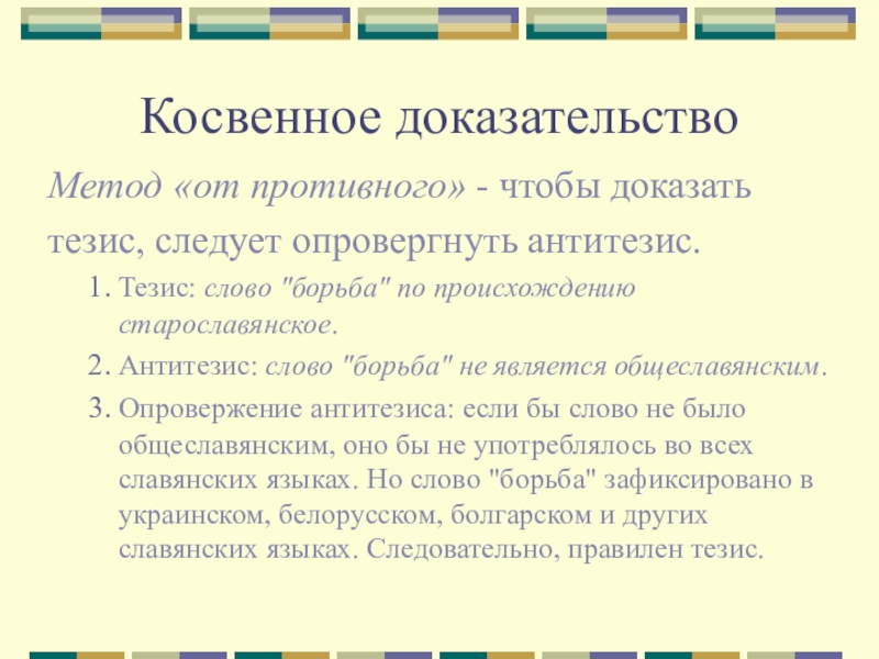 Опровержение антитезиса: если бы слово не было общеславянским, оно бы не употреблялось во всех славянских языках. Но слово "борьба" зафиксировано в украинском, белорусском, болгарском и других славянских языках. Следовательно, правилен тезис.