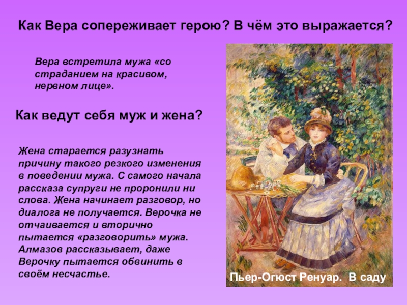 Она понимает, что доставляет удовольствие мужу, поэтому вновь и вновь расспрашивает его, пытается разузнать подробности
