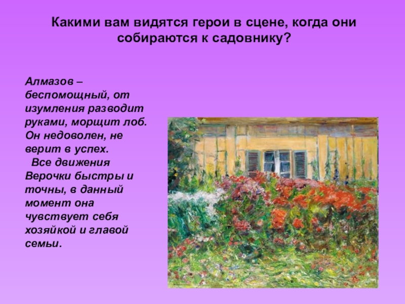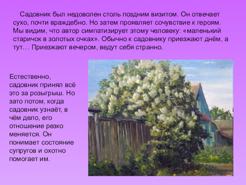 Естественно, садовник принял всё это за розыгрыш. Но зато потом, когда садовник узнаёт, в чём дело, его отношение резко меняется. Он понимает состояние супругов и охотно помогает им.