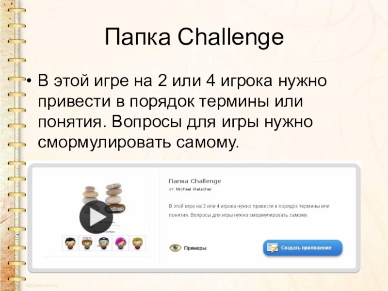 Папка ChallengeВ этой игре на 2 или 4 игрока нужно привести в порядок термины или понятия. Вопросы