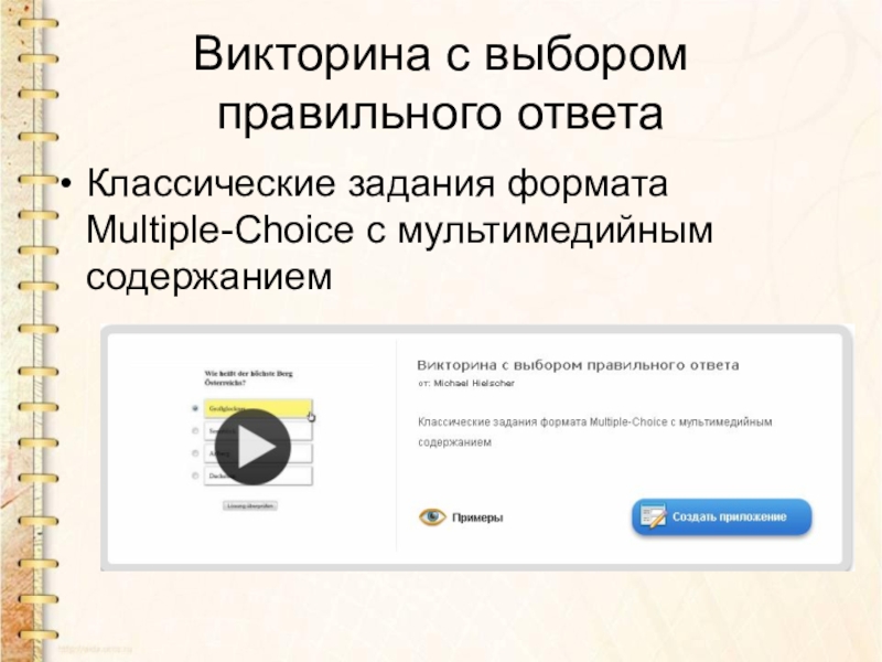 Викторина с выбором правильного ответаКлассические задания формата Multiple-Choice с мультимедийным содержанием