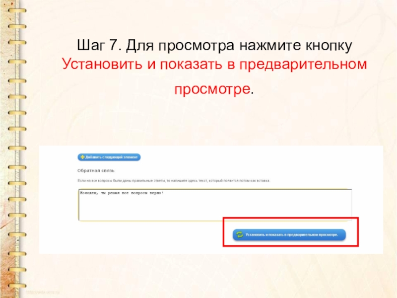 Слайд 24Шаг 7. Для просмотра нажмите кнопку Установить и показать в предварительном