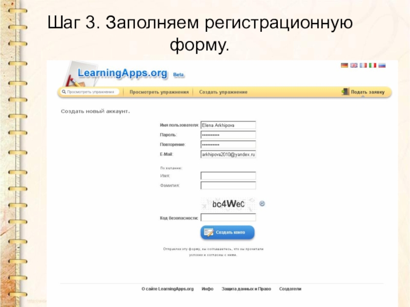 Слайд 5Шаг 3. Заполняем регистрационную форму.